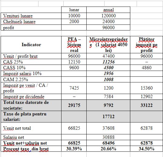 In scenariul analizat, activitatea genereaza venituri anuale de 120.000 lei si cheltuieli deductibile de 24.000 lei, rezultand un profit economic de 96.000 lei. Pe baza acestui nivel de profit sunt comparate trei forme de organizare: PFA in sistem real, microintreprindere cu un salariat platit la nivelul de 4.050 lei si societate platitoare de impozit pe profit.