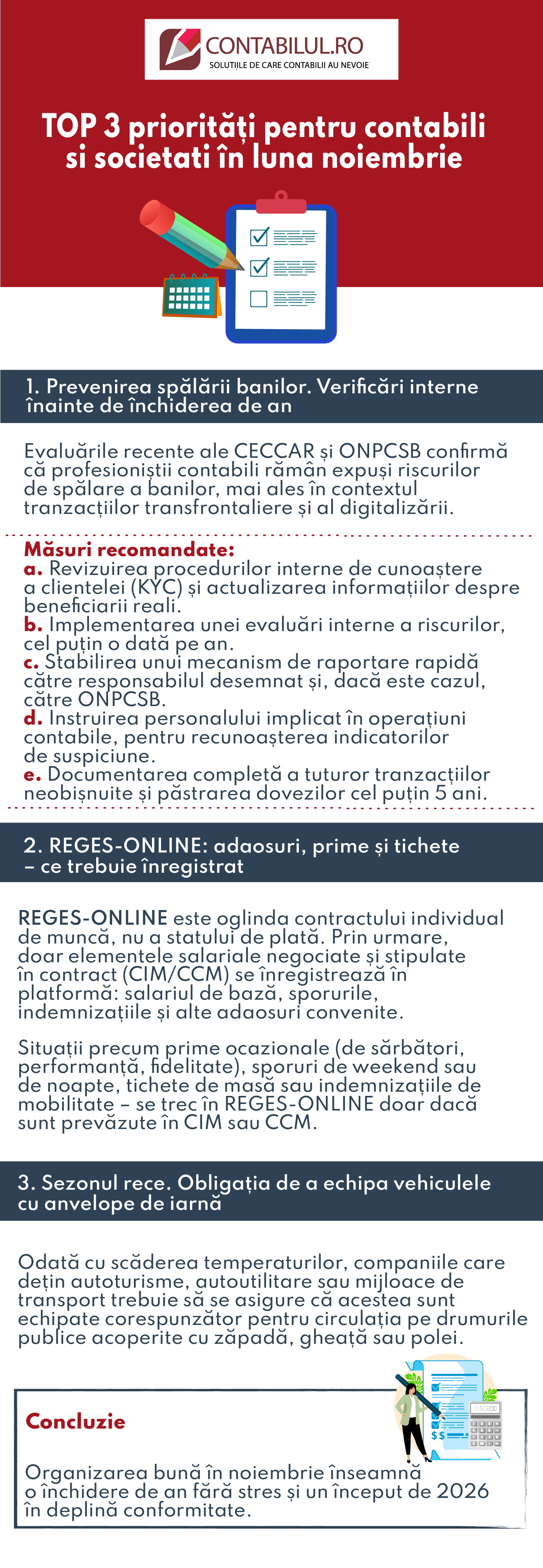 Noiembrie 2025 este o luna de tranzitie de la conformarea curenta la pregatirea anului fiscal 2026. Este momentul ideal pentru actualizarea procedurilor de prevenire a spalarii banilor, corectarea datelor din REGES-ONLINE si pregatirea inchiderii de an.
