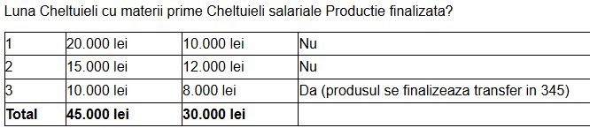 In prima luna rezultatul contabil este zero, costurile de productie fiind colectate in contul 331 (sold final 30.000 lei).