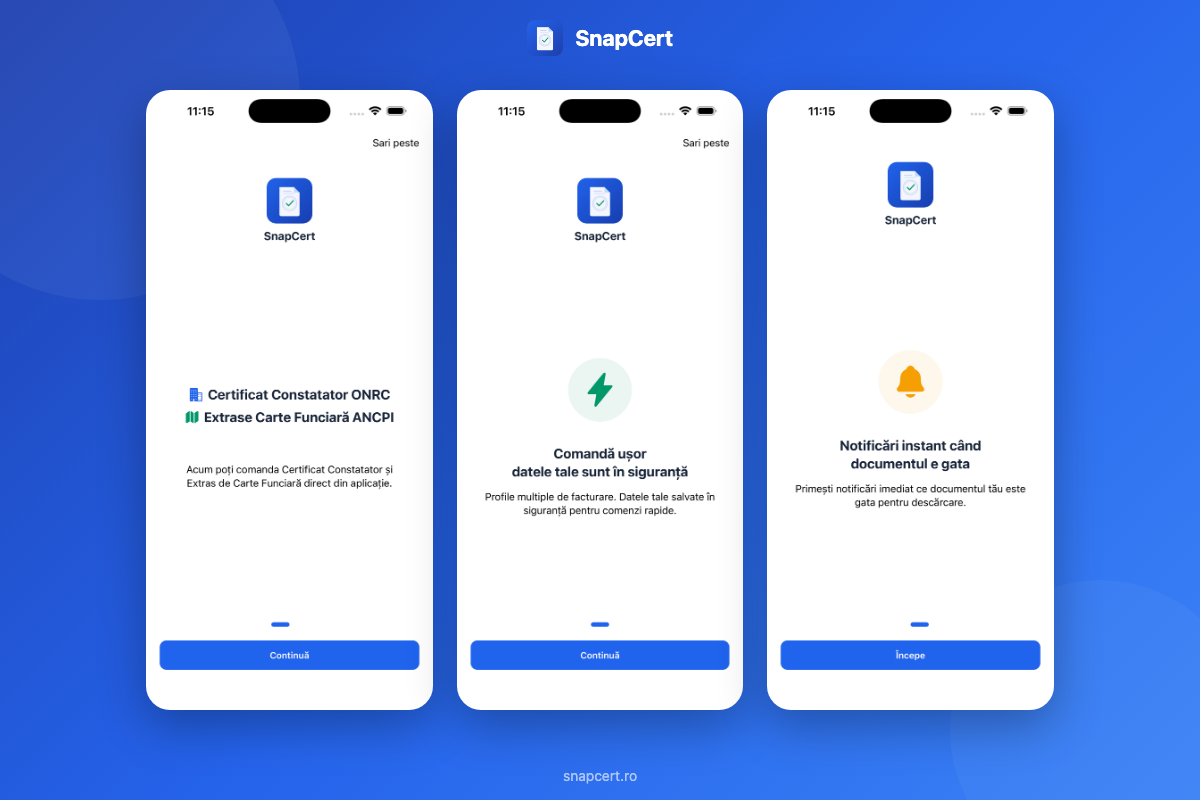 SnapCert este o aplicatie mobila si web care reuneste ambele servicii intr-un singur loc. Introduci datele, platesti, primesti documentul semnat electronic direct in aplicatie si pe email, in cateva minute.