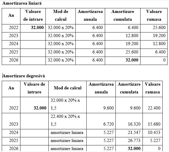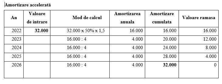 Incepand cu anul 2024 se calculeaza amortizare liniara, intrucat amortizarea anuala degresiva calculata (15.680 x 20% x 1,5 = 4.704) este mai mica sau egala (in acest caz mai mica) decat amortizarea liniara calculata raportand valoarea ramasa la durata de utilizare ramasa (15.680 :3 = 5.227).